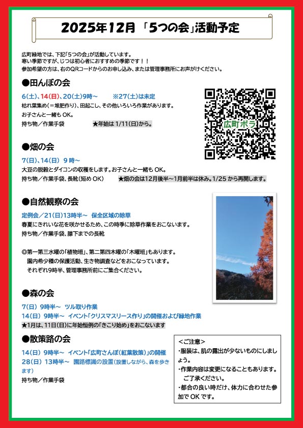 2025年10月から2026年3月までの広町緑地で行われるイベント情報をお知らせします。 ここをクリックして、ポスターをご覧ください。 1月から3月までのイベントで、日時の確定していないものは決まり次第、ニュースでご案内します。 |
