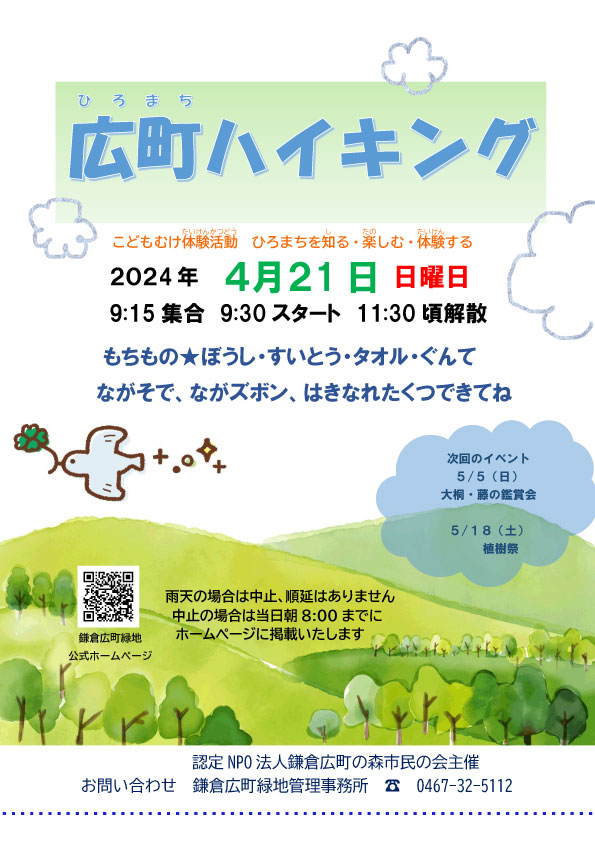 曇りがちで時々晴れ間ものぞくお天気の中、子供向け体験イベントの「広町ハイキング」が開催されました。 距離もあり、坂道もある広町の園内を3歳や5歳のお子さんも最後まで自分で歩きました。達成感を感じながらゴールで 飲んだジュースは一層美味しく感じたこととでしょう。大船高校ボランティア部のみなさんもご参加くださり、 お子さんたちの列の間に入って声をかけながら、一緒に歩きました。