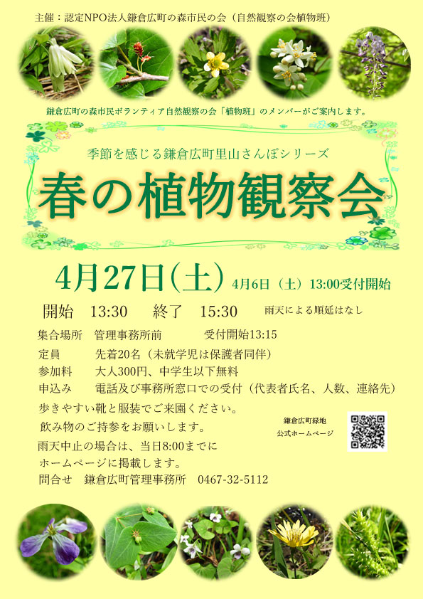 季節を感じる広町散歩シリーズの一つ、「春の植物観察会」が開催されました。 午前中の雨も上がり、21名の大勢の方に参加していただき、無事スタートしました。 鎌倉広町市民ボランティア「自然観察の会」の植物班のメンバーがガイドとなって、園路を歩きながら 丁寧に観察をしながら園内を散策しました。初めて広町緑地にいらした方も、美しい場所に植物ばかりでなく、鳥も虫もいて 楽しかった、普段あまり目にしない植物も見ることができたと早くも次回を楽しみにする声が上がりました。、