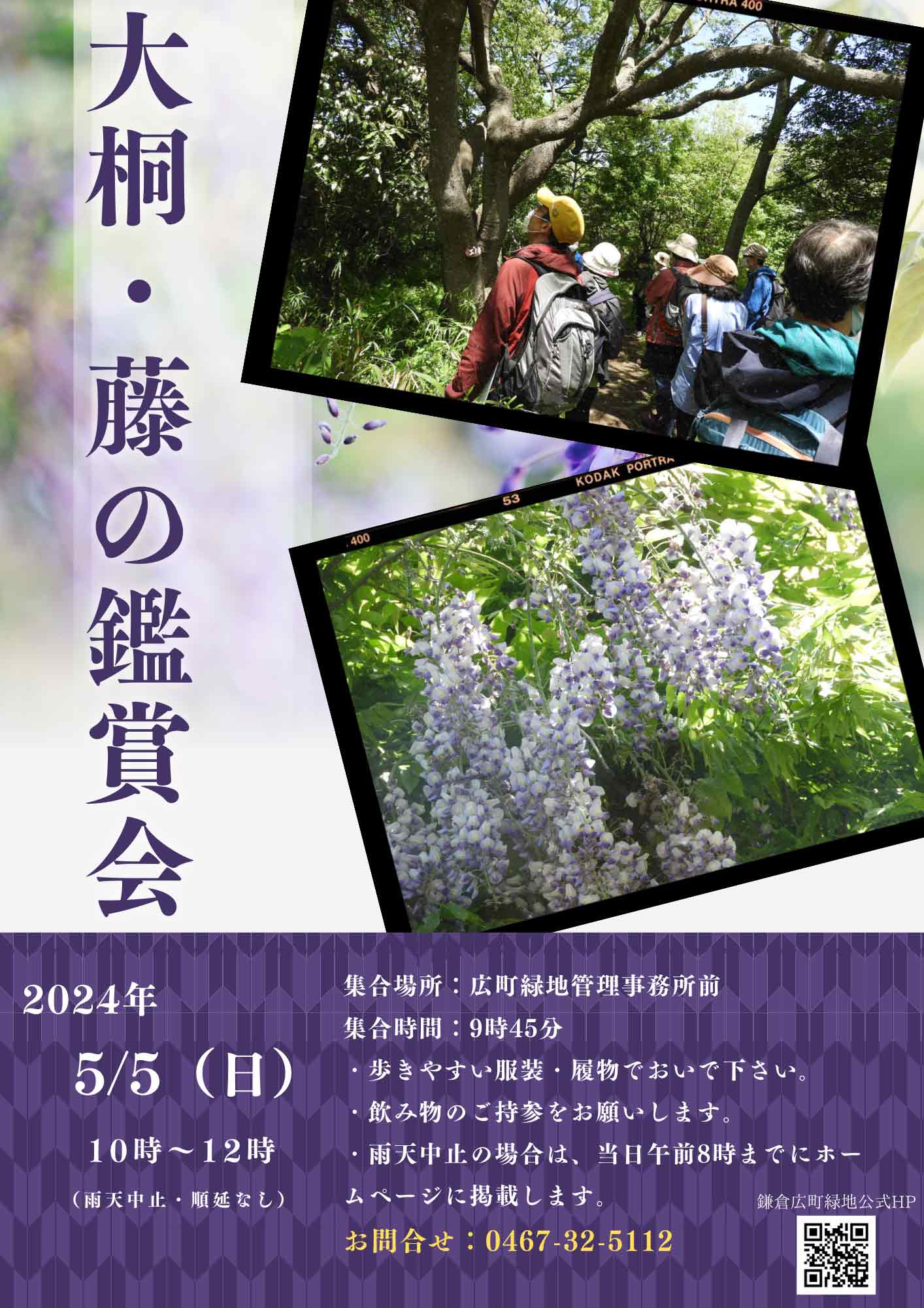 お天気に恵まれたゴールデンウィークも後半となった5月5日、大桐と藤の鑑賞会が開催されました。 昨年は見事な藤が見られましたが、今年は数も少なく、また、あっという間に散ってしまい、 藤は全く見ることができませんでした。大桐も5月3日には見頃を迎えていましたが、残念ながら今日は盛りを過ぎた、 大桐の鑑賞となりました。その代わりに、日頃は目に留まることの少ない、木々の生態にについて 観察しながら新緑が眩しい広町緑地を散策しました。