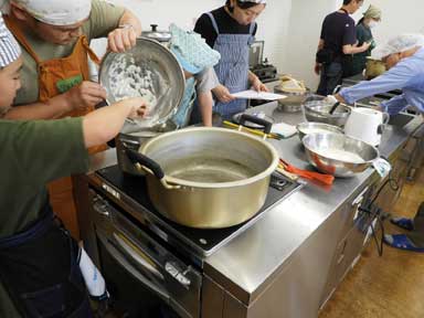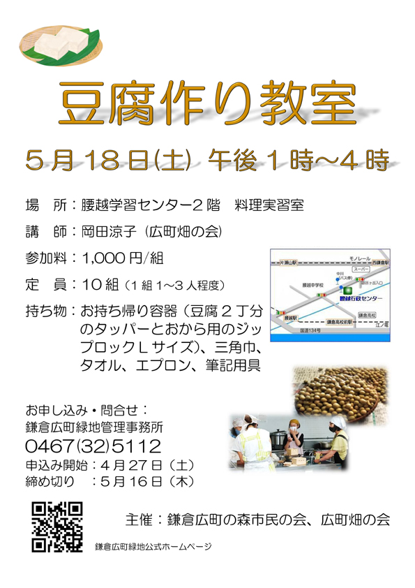 毎年人気の「豆腐づくり教室」が腰越学習センター料理実習室で開催されました。 講師は鎌倉広町緑地市民ボランティア「畑の会」の岡田涼子さんです。 講師の岡田さんの説明を受けながら大人と子供が一緒になって豆腐づくりを体験しました。 子どもたちも、混ぜたり、温度を測ったり、途中で味見をしたりなど大活躍で参加しました。 今回は飛び入りでプロの方も参加され、いろいろなアドバイスをしたり、他のテーブルをお手伝いしたり なさっていました。最後には見事な滋味豊かなお豆腐が出来上がりました。