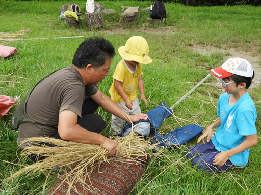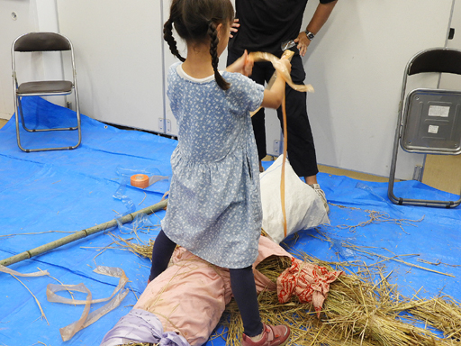 まずは、1グループ4~6名の6グループにわかれて、竹の骨組みに衣装を着せ、ワラで肉付けをするところからスタートです。