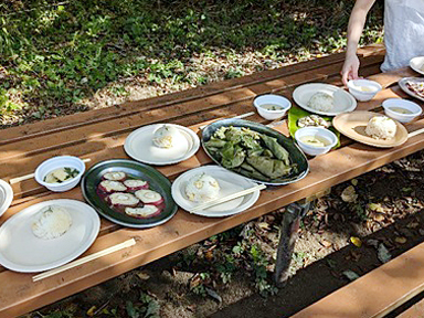 ぺぺス(インドネシアの料理でもとはバナナの葉に具材を包んで蒸し焼きにしたもの)、ジンジャーリリーウォーター、野草の塩釜焼(魚、鶏肉)、カキドオシのデザート。