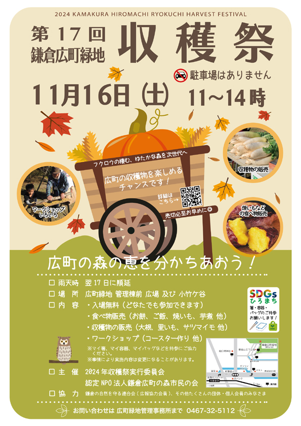 前日からの雨で開催が危ぶまれましたが、当日は雨が上がり、第17回鎌倉広町緑地 収穫祭が、11月16日(土)に開催されました。