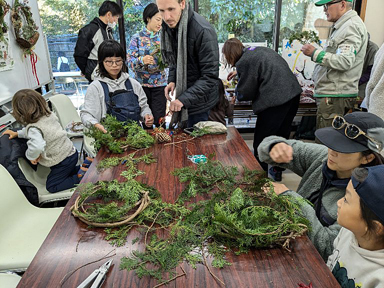 毎回、すぐに予約がいっぱいになってしまう、人気のイベントです。森の会が事前に作ったリースの輪に、ヒノキの葉を巻き